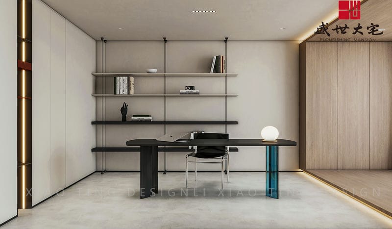 無(wú)論是充當(dāng)書(shū)房,或是家庭功能區(qū),皆能輕松轉(zhuǎn)換。明暗以及光影的交錯(cuò),使得簡(jiǎn)約的空間更有靈動(dòng)感,以書(shū)桌為主體,在透明與暮色的調(diào)和點(diǎn)綴下,純凈高雅的氣息順勢(shì)而出。