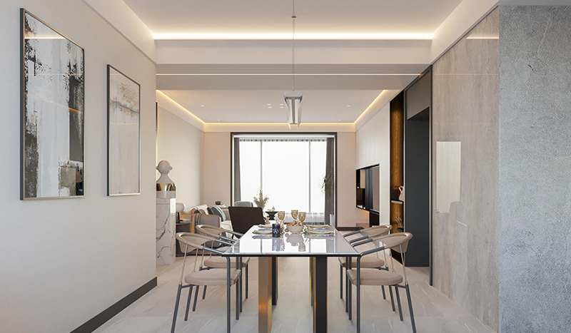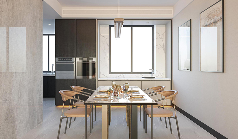 簡約的餐椅組合,營造輕松舒適的開放空間,吊燈提升整個空間的活躍度。