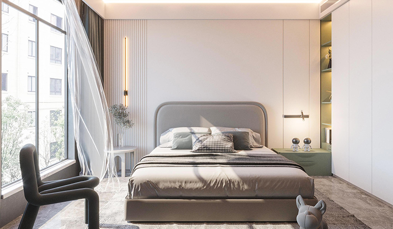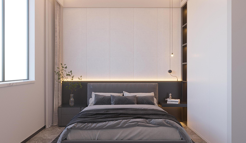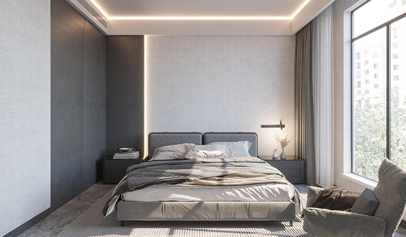 主臥背景墻為木飾面內(nèi)嵌燈帶,增加氣氛感,與轉(zhuǎn)角處的衣帽間隱形門成為整體,化零為整。除了床品以外,其他不容易更換的軟裝,例如窗簾,吊燈和床,都選擇了灰色,更有質(zhì)感,而且百搭,不論冷色暖色的床品都可以搭配。