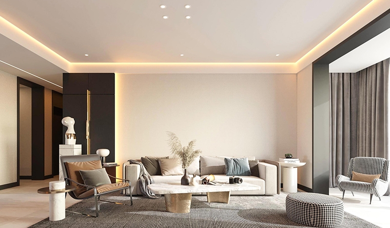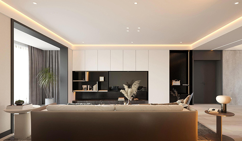 利用隱形門彌補(bǔ)電視背景墻與沙發(fā)背景墻不對稱的弱點(diǎn),隱形門外提就勢做電視柜滿足更大的儲物空間。地面材質(zhì)通鋪增大空間視覺延伸感,用無主燈和燈帶滿足照明,視覺干凈清爽。