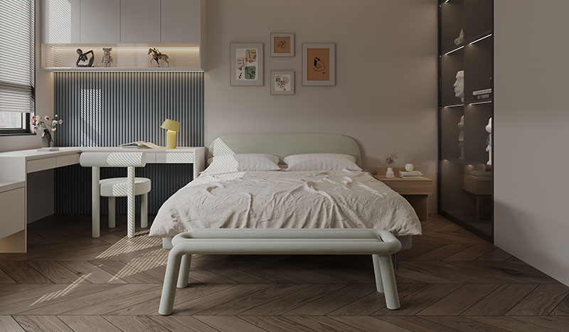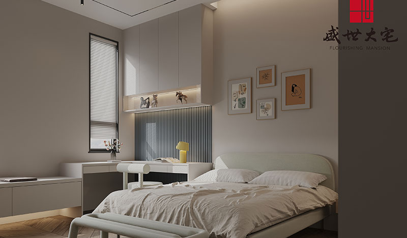 二樓上樓梯處以懸浮柜體作為隔斷,與墻面分離,做出層次。起居室以收納,閱讀為主。主臥以墻板硬包作為裝飾,兩個(gè)男孩房盡量不做過(guò)多修飾,房間都以簡(jiǎn)潔明快位主。