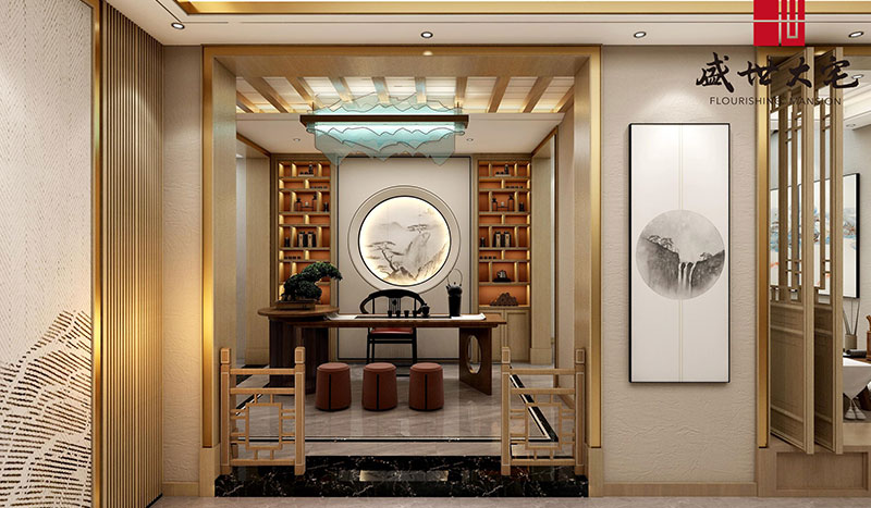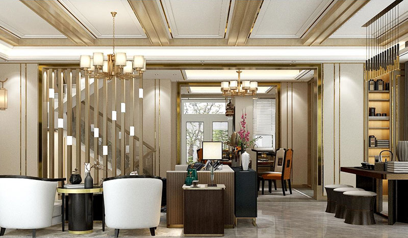 二層將原本挑空處增建新中式風(fēng)格墻面,看似簡單,卻暗藏雅韻質(zhì)感的設(shè)計。