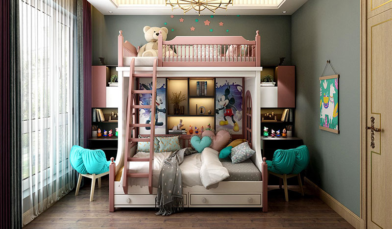女兒房與多功能室之間增設(shè)挑空,放置兒童上下床增加空間使用功能,也增強了空間的大小和使用性。在需要隔絕視線的地方,則使用中式的屏風(fēng)或窗欞,通過這種新的分隔,單元式住宅就展現(xiàn)出中式家居的層次之美