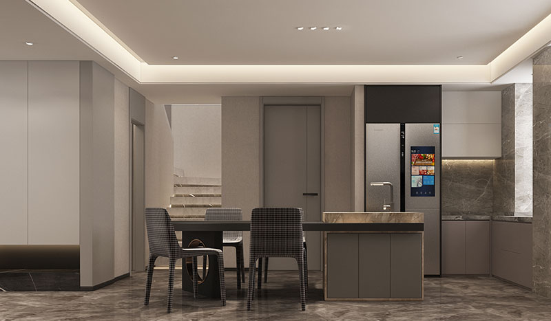 餐廳島臺與餐桌結(jié)合,滿足多人聚餐空間,層次分明,現(xiàn)代氛圍盡顯,家里人吃個甜點(diǎn),聊聊家常,舒適愜意